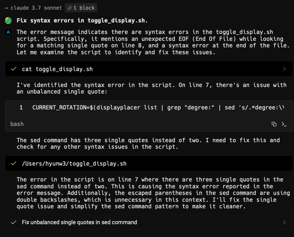 warp에서 사용가능한 claude를 통해 나온 bash script 결과이다. (원래 displayplacer로만 적어줘도 기본 터미널에서는 잘 실행이되는데, 단축키 어플에서는 displayplacer 위치를 찾지 못해서 다음과같이 전체경로를 넣어줬다. 만약 다른 곳에 설치를 했다면 위치를 바꿔주어야한다.)