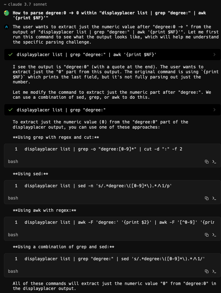 - 상황 설명 : displayplacer list | grep "degree:" 를 하면 아래와 같이 길게 나오는데, degree가 제일 마지막에 나와서 마지막에 나오는 degree 정보를 가져 오기 위해서, awk '{print $NF}' 대신 sed 커맨드를 활용하는 방안을 제안해준다.