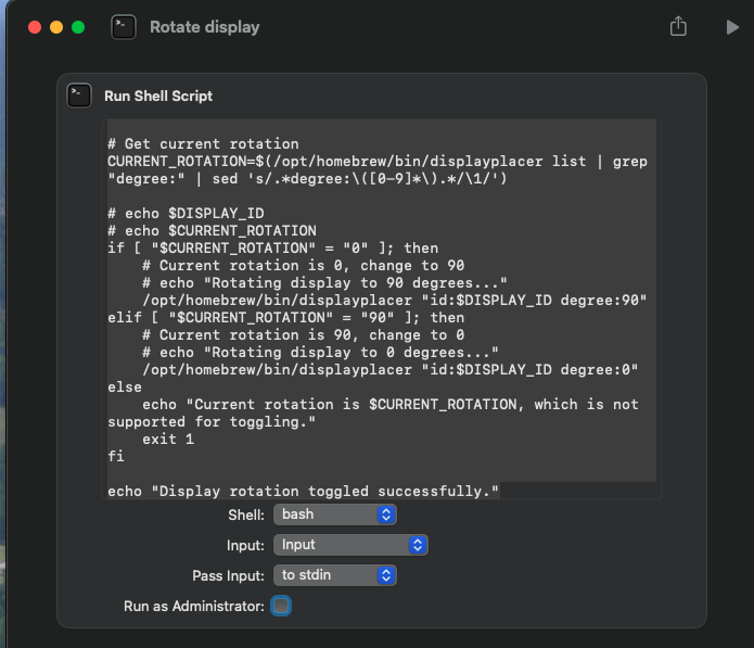- 이 코드를 단축키로 활용하기 위해 맥에 존재하는 shortcuts.app을 활용해 아래에 rotate display라는 스크립트를 만들어주었다. (위의 코드를 아래처럼 넣어주면된다)